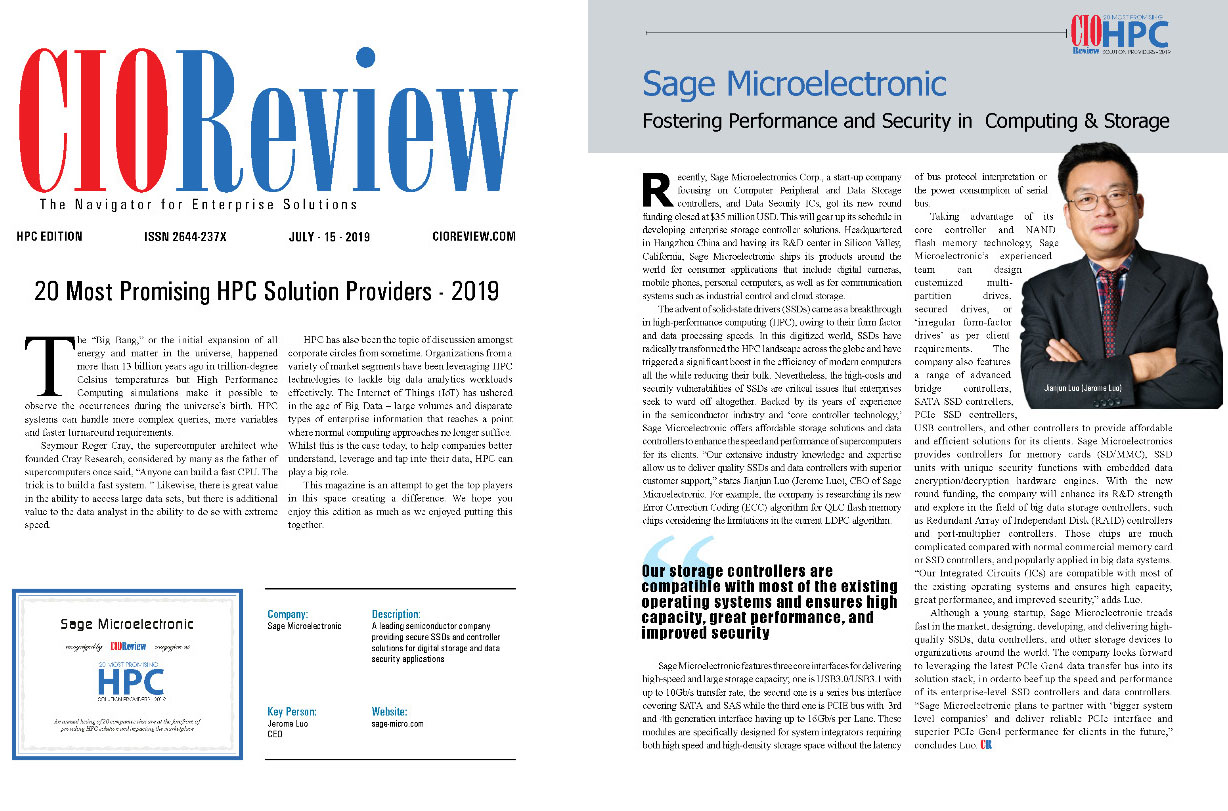 7月15日,美國媒體CIOREVIEW公布2019年20個最有潛力HPC解決方案供應商名單,中國大陸企業(yè)華瀾微電子股份有限公司(Sage Microelectronic Corp)入選。這是繼2017年浪潮入選之后,中國大陸企業(yè)再一次登榜。