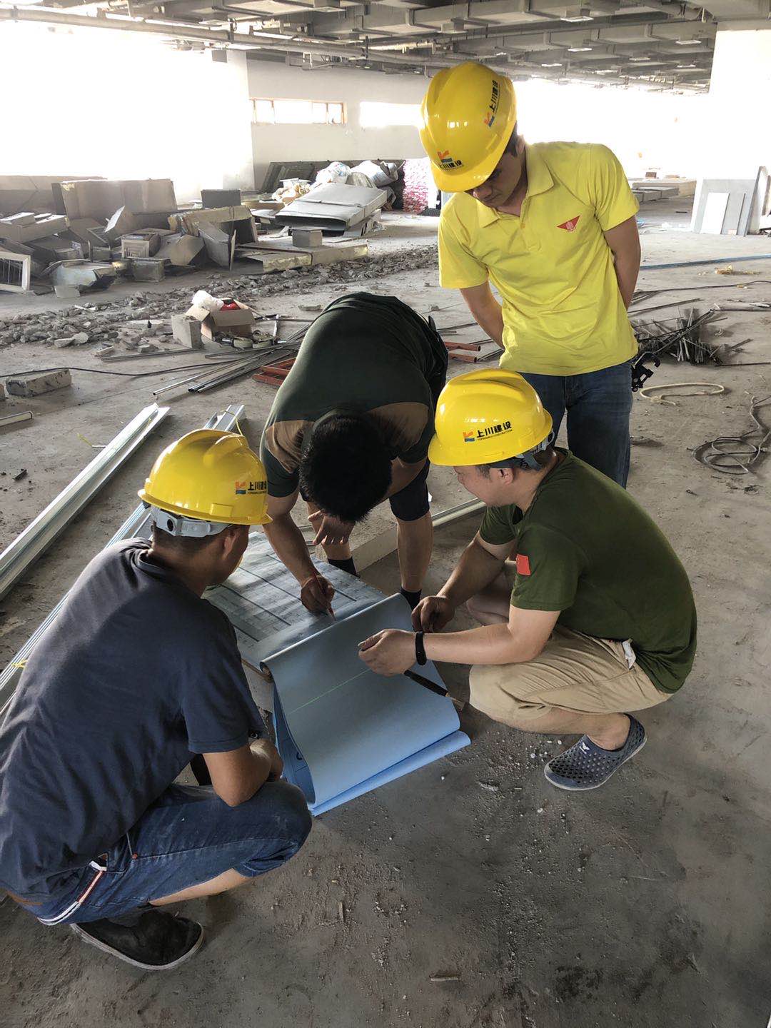 工作人員現(xiàn)場(chǎng)研究討論施工圖紙,嚴(yán)格指導(dǎo)工人按圖作業(yè)施工,確保工程進(jìn)度按照上川建設(shè)的工藝流程,有序開(kāi)展。