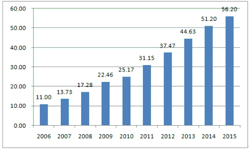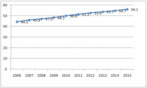我國的城鎮化率在不斷提高,十二五期間,我國城鎮化進程穩步推進,城鎮化率顯著提升,年均提高1.23個百分點,每年城鎮人口增加2000萬,到2015年,我國的城鎮化率已經提高至56.1%,城鎮常住人口為7.71億。盡管如此,我國城鎮化率還是遠低于發達國家80%的平均水平,也低于人均收入與我國相近的發展中國家60%的平均水平,還有較大的發展空間。