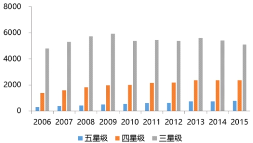 高端星級酒店存量改造市場年均增速料將超過10%。隨著國內商務活動的逐漸增多和旅游的興起,國內星級酒店得到了快速發展。截止到2015年,全國星級飯店統計管理系統中共有12327家星級飯店,其中五星級789家,四星級2375家,三星級5098家。2006-2015年度,全國五星級、四星級、三星級酒店數量的年均增長率為11.26%6.31%0.72%,呈現出較平穩的發展態勢。未來幾年,十年內新開業的高端星級酒店,特別是五星、四星酒店將迎來重新裝飾改造的高峰。
