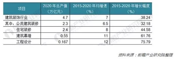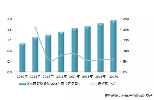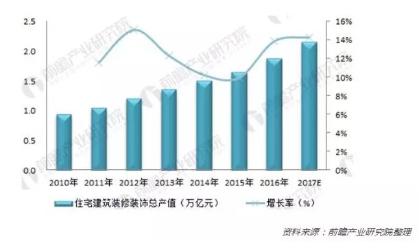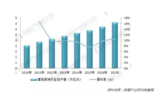 根據中國建筑裝飾協會的數據顯示,2016年全國建筑裝飾行業完成工程總產值3.73萬億元,比2015年增加了3400億元,增長幅度為9.7%。比宏觀經濟增長速度高出3個百分點,體現了建筑裝飾行業在國民經濟發展中的基礎性和超前性。預計在2017年宏觀經濟回暖的情況下,建筑裝飾行業工程總產值有望進一步增長至4.12萬億元,較2016年增長10.46%